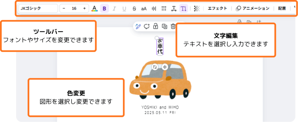 このテンプレートでは、「文字」と「図形の色変更」が可能です(Canva無料プラン対応)