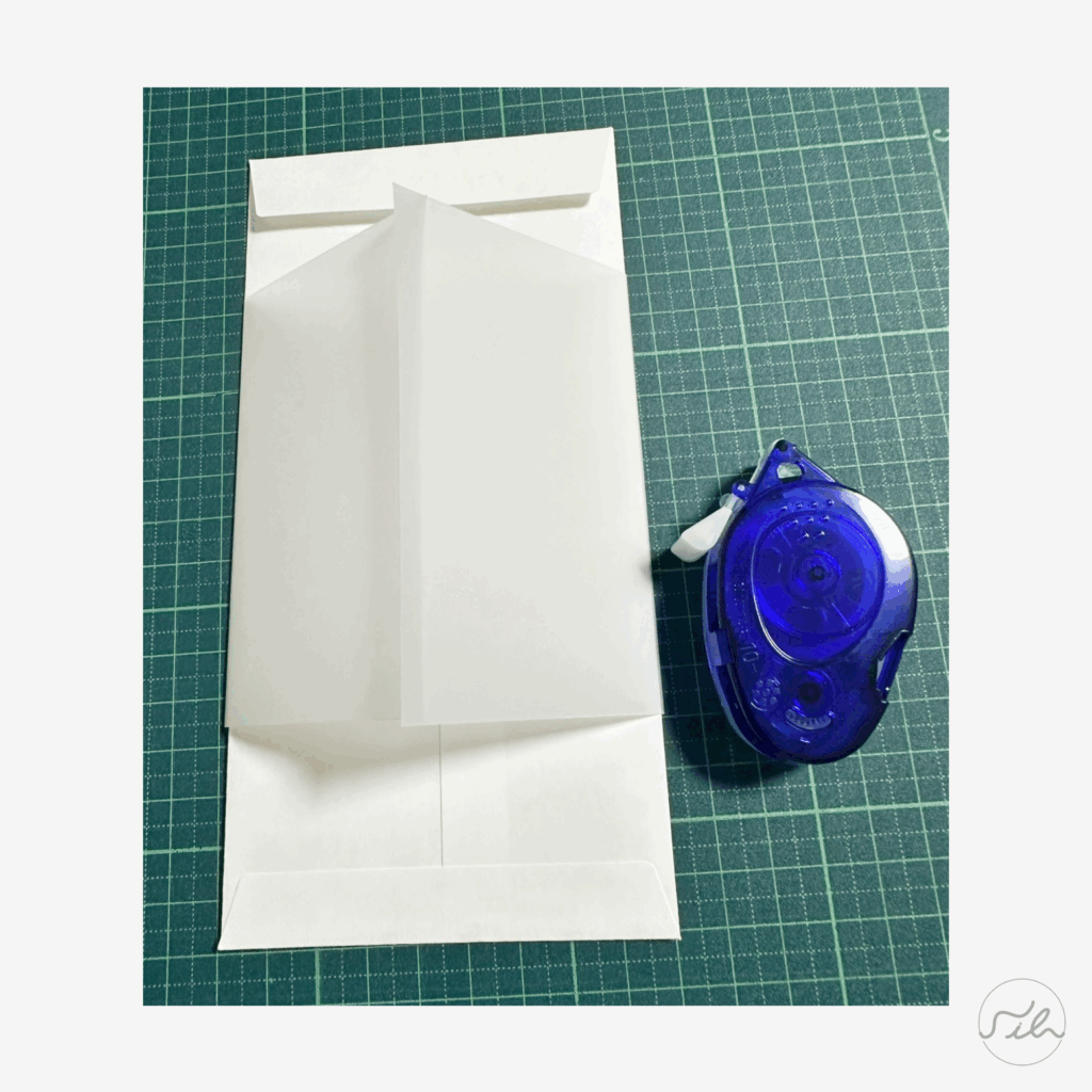 4.封筒の裏側で重なり部分の片方にテープのりをつけ、貼り合わせます
