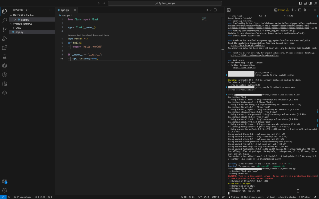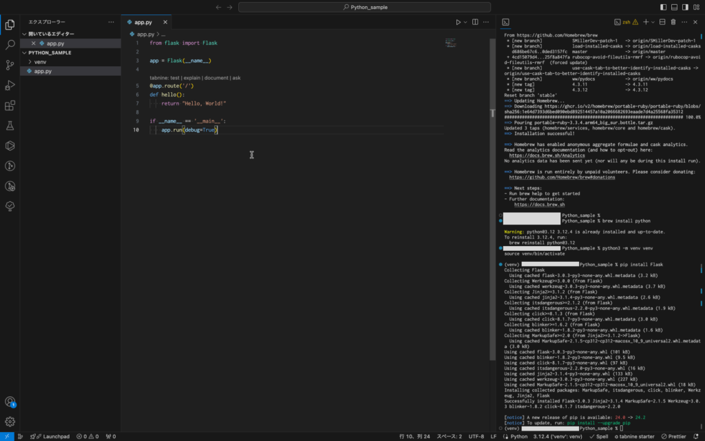 このコードは、Flaskアプリケーションを作成し、/にアクセスしたときに「Hello, World!」というメッセージを表示します。