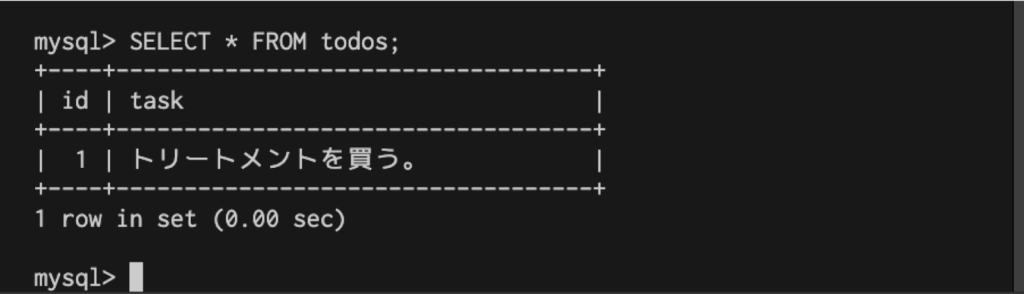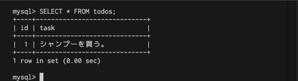 ③以下のSQLを実行し、テーブルにデータが登録されていることを確認してみます。