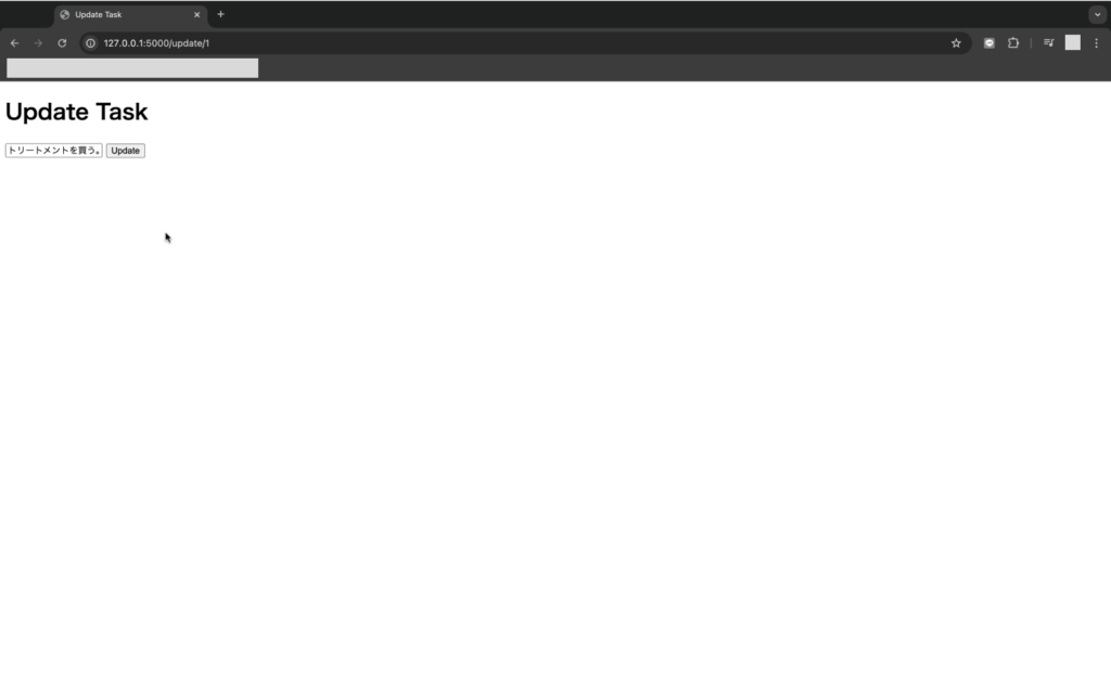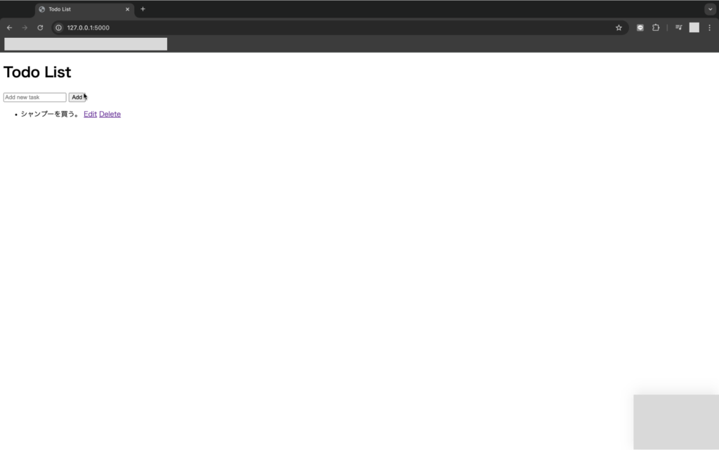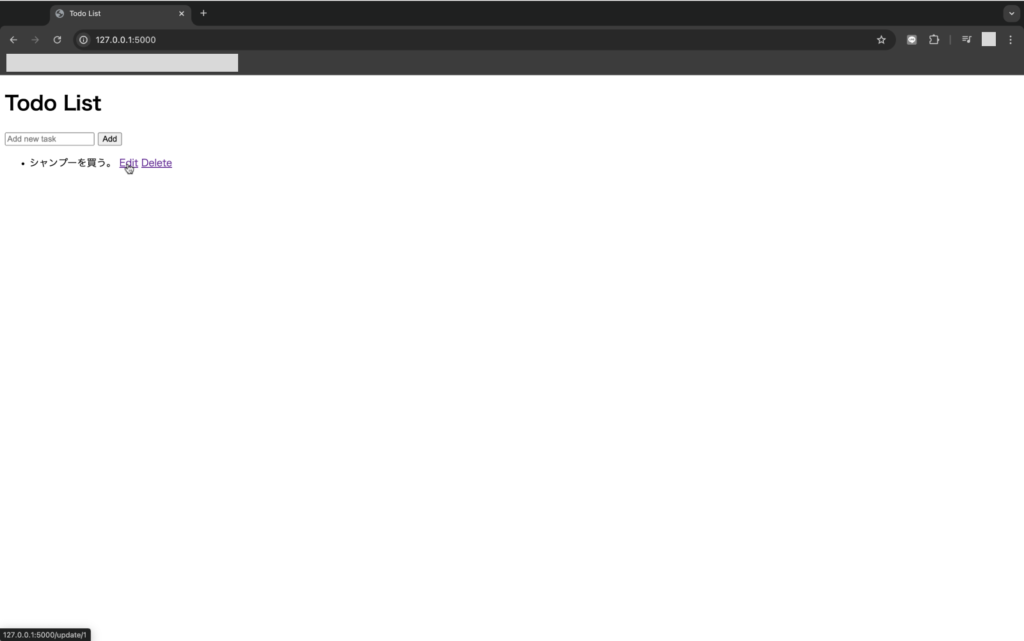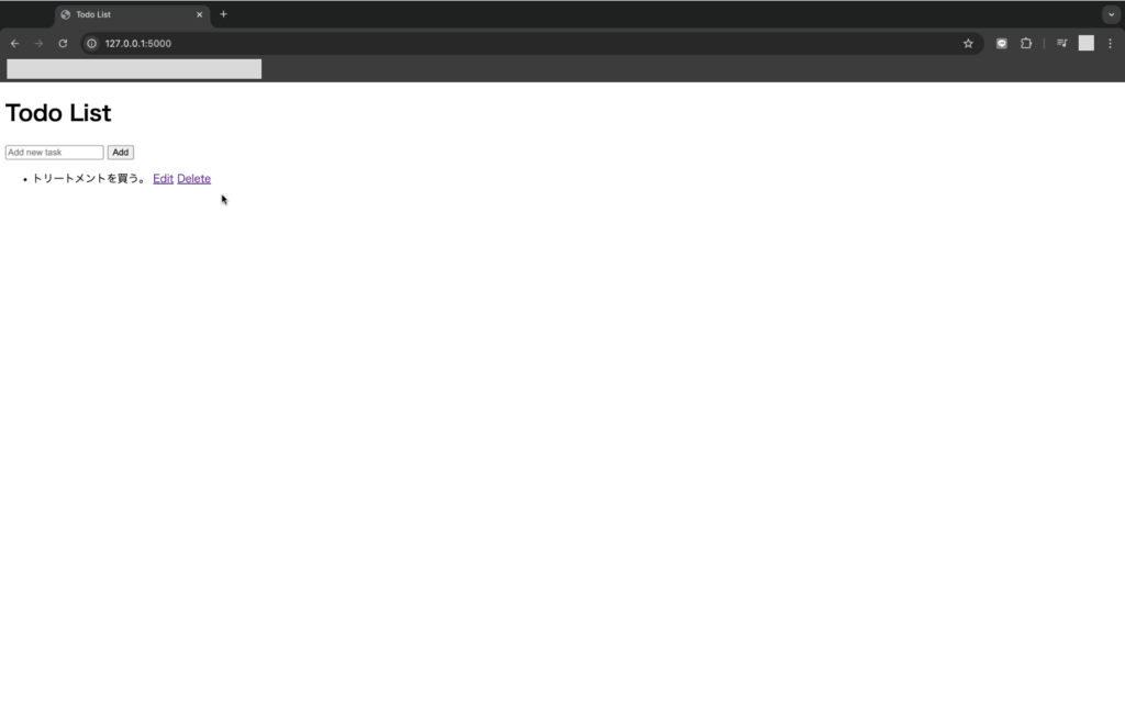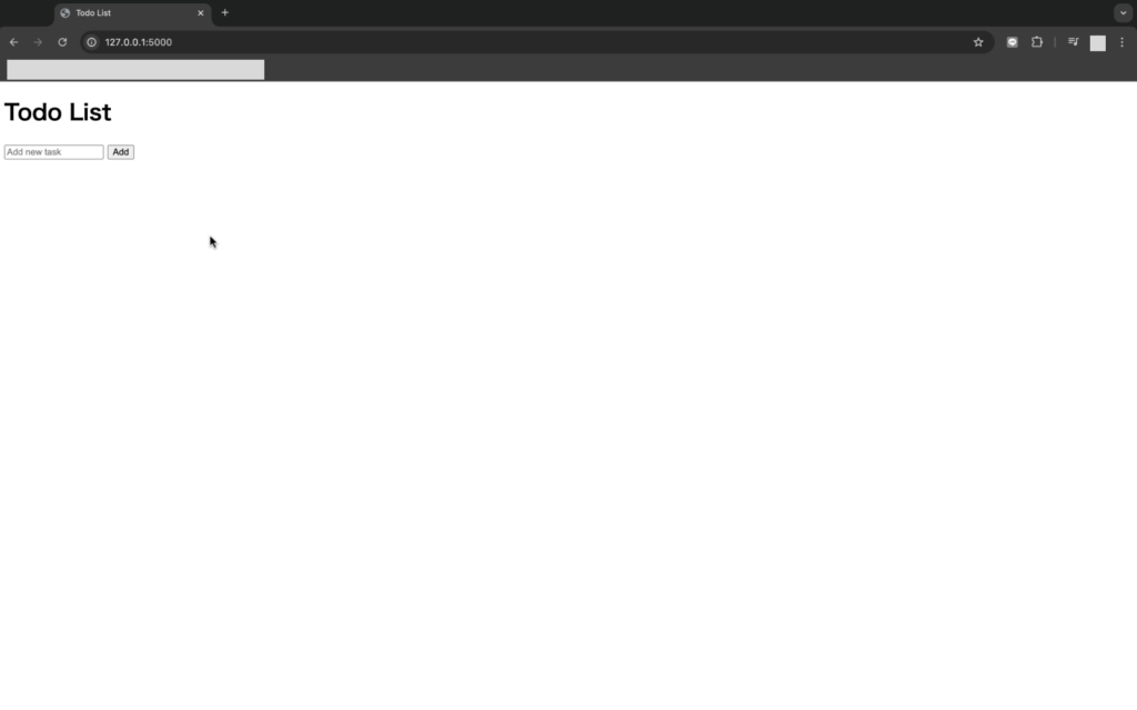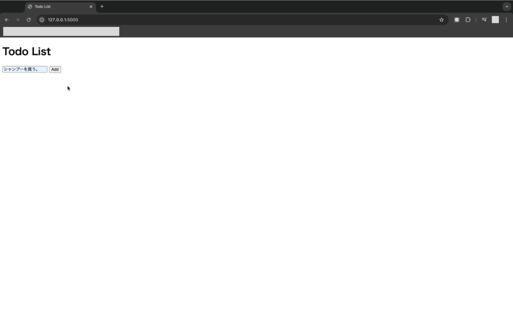 ⑧ブラウザのアドレスバーに「http://127.0.0.1:5000」を入力し、アクセスすると、Todoリストの画面が表示されます。