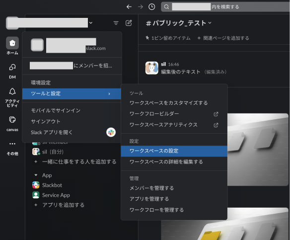 ②ワークスペース名をクリックし、「ツールと設定」ー「ワークスペースの設定」をクリックします。