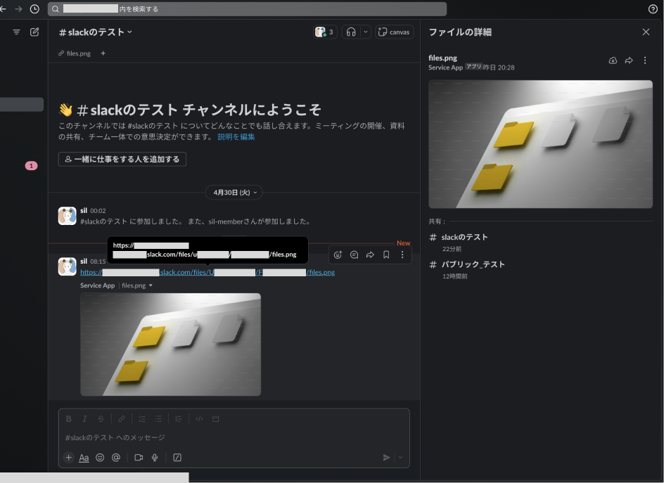 変更後にSlackの画面に戻り、投稿のリンクをコピーするとワークスペースのドメインが変更されていることを確認できます。