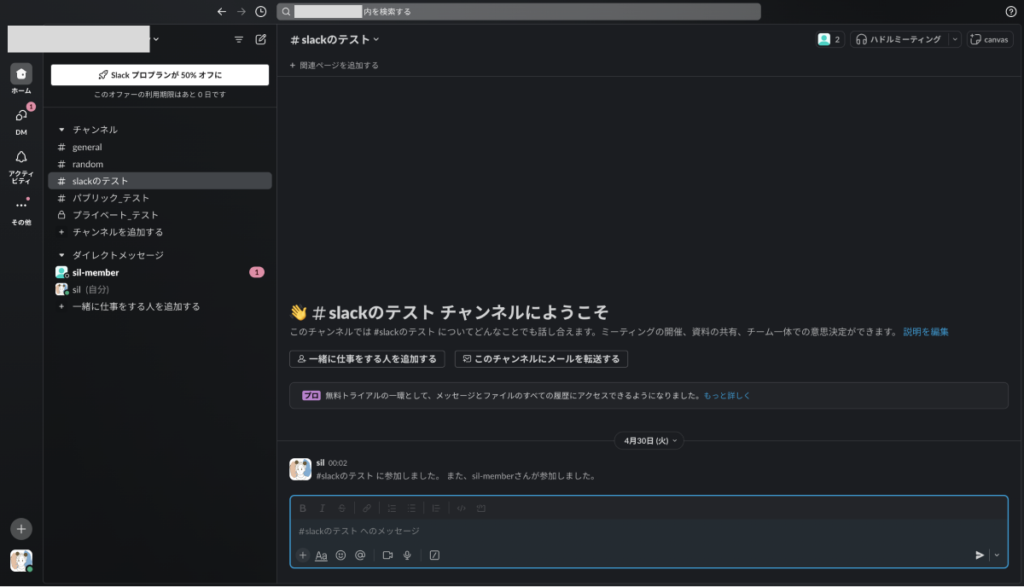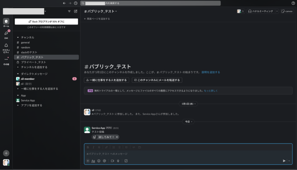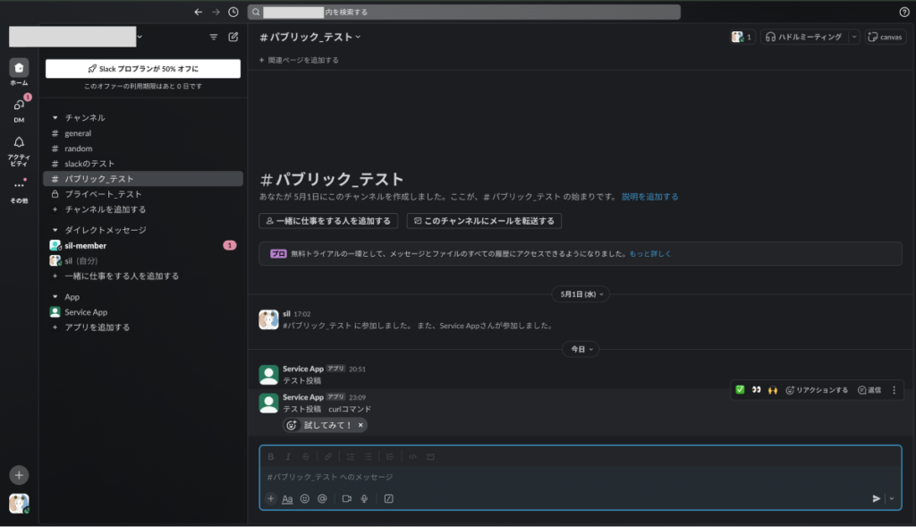 ③ チャンネルを確認すると、メッセージが投稿されていることを確認できました。
