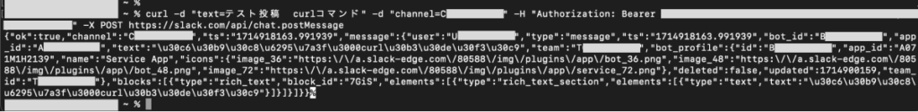 curl -d "text=テスト投稿 curlコマンド" -d "channel=CXXXXXXXXXX" -H "Authorization: Bearer xoxb-not-a-real-token-this-will-not-work" -X POST https://slack.com/api/chat.postMessage