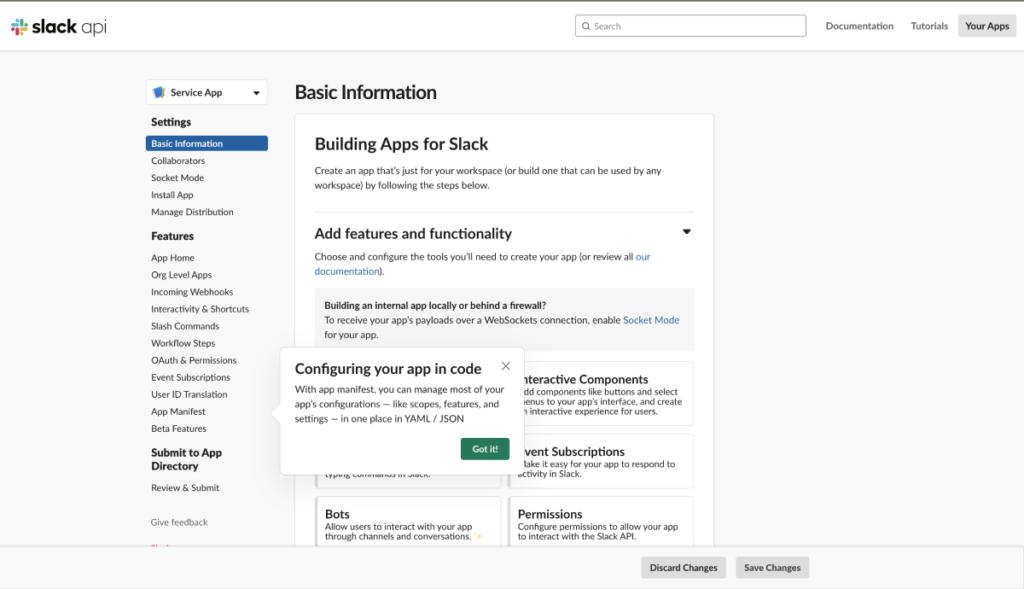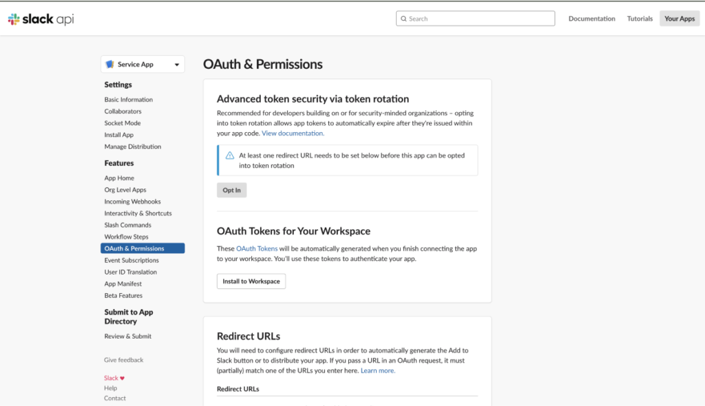 ⑧ 以下の画面が開いたら、左サイドメニューから「OAuth&Permissions」をクリックします。