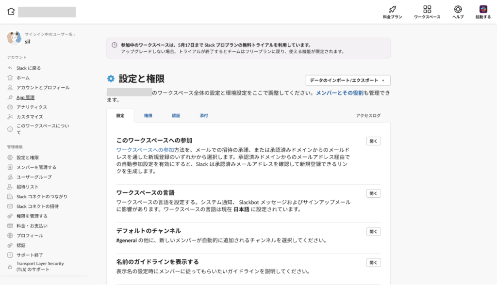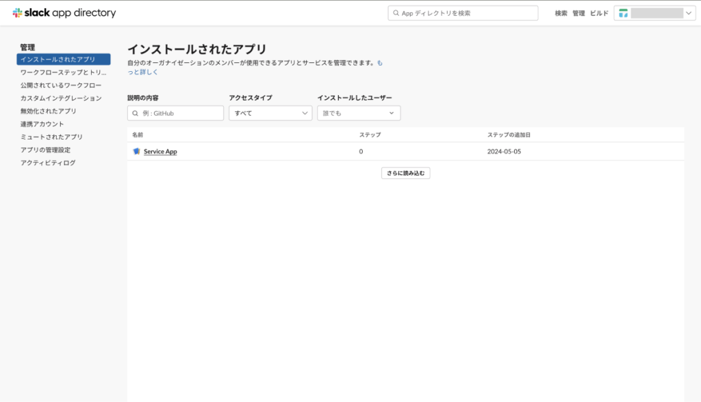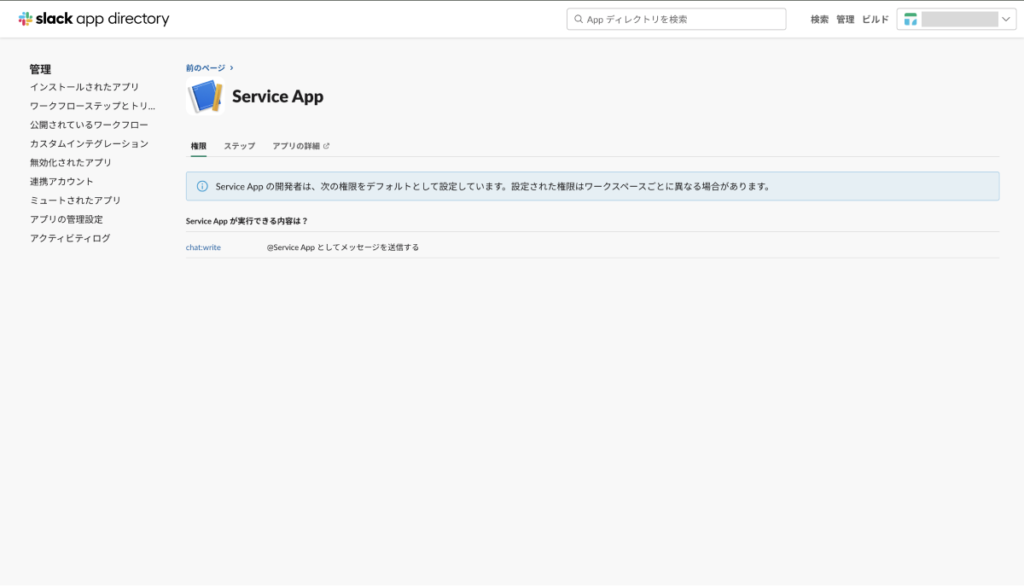 ⑭ ワークスペースの設定画面から確認すると先ほど作成したアプリが、追加されていることを確認できました。
