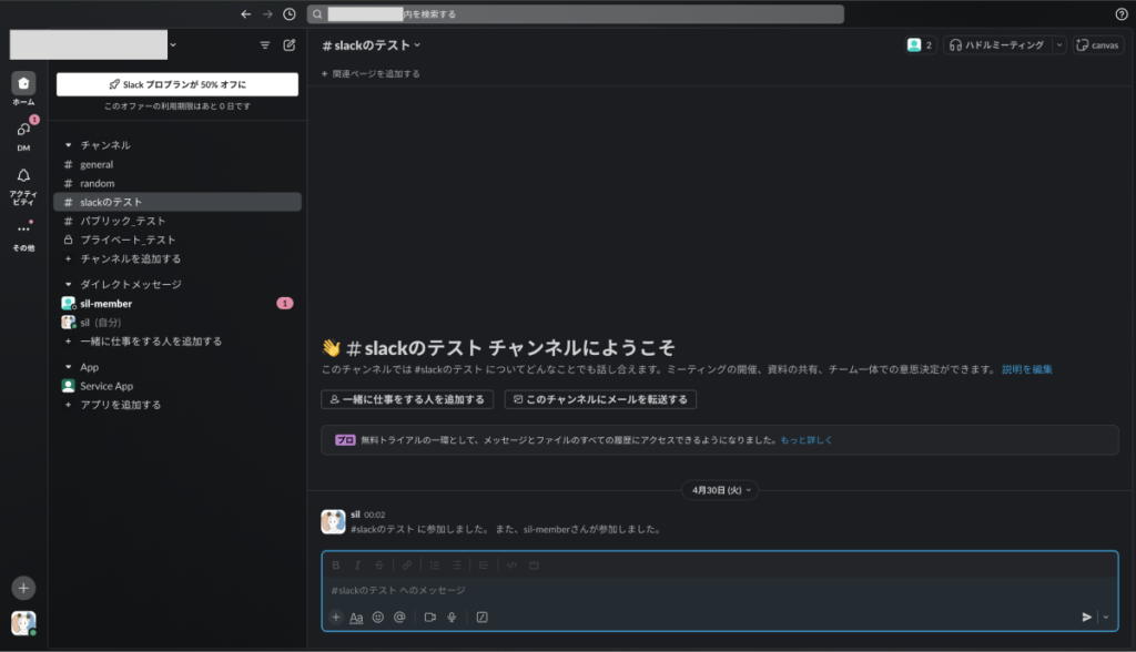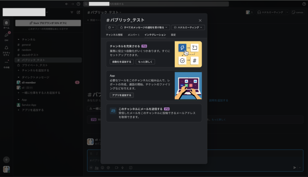 画面中央上部のチャンネル名をクリックします。(今回の場合は、「#パブリック_テスト」)