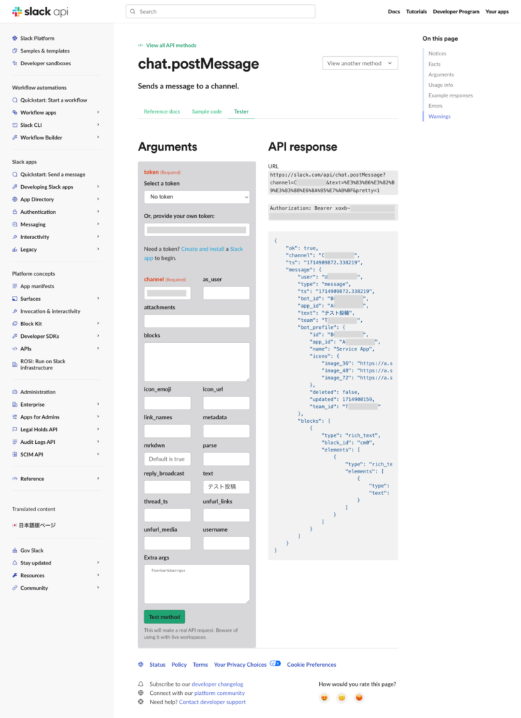 - Slackの「Web API Method」の「Tester」機能でテスト投稿