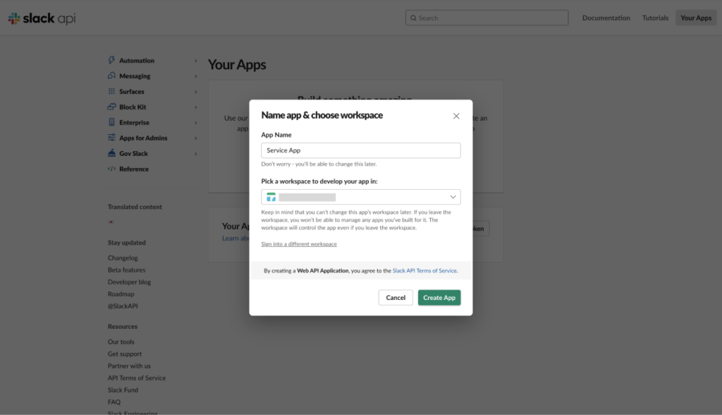 「Pick a workspace to develop your app in :」では、自分のワークスペースを選択します。