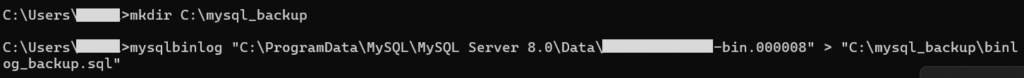 mysqlbinlog C:\ProgramData\MySQL\MySQL Server 8.0\Data\SUBLIMATION01-bin.000008 > C:\ProgramData\MySQL\MySQL Server 8.0\Data\binlog_backup.sql