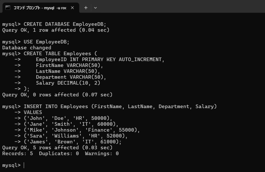 ✅ データベースEmployeeDBとEmployeesテーブルを作成し、データを挿入