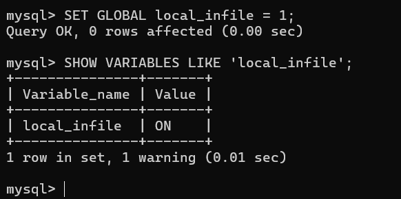もしlocal_infileが OFF のままなら、my.cnf または my.ini ファイルの [mysqld] セクションに以下を追加し、MySQLを再起動。