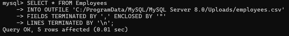 INTO OUTFILE 'C:/ProgramData/MySQL/MySQL Server 8.0/Uploads/employees.csv'