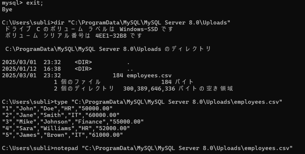 LOAD DATA INFILE 'C:/ProgramData/MySQL/MySQL Server 8.0/Uploads/employees.csv'