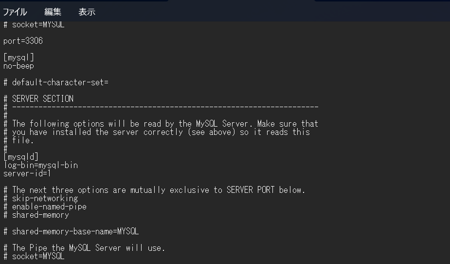 [mysqld]セクションを探し、以下を追加[mysqld]log-bin=mysql-binserver-id=1 - ファイルを保存して閉じる