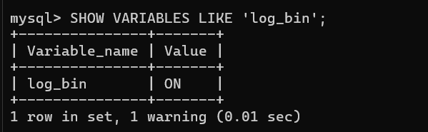 MySQLにログインして、バイナリログが有効になっているか確認:
