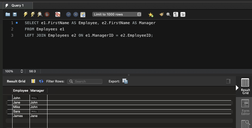 LEFT JOIN Employees e2 ON e1.ManagerID = e2.EmployeeID;
