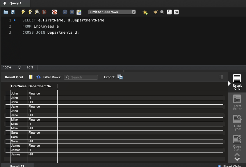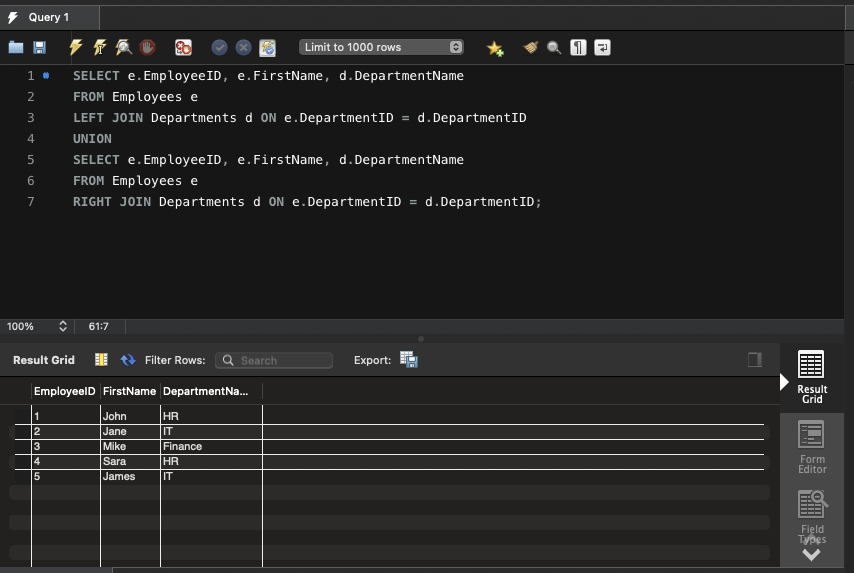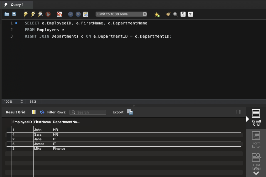 RIGHT JOIN Departments d ON e.DepartmentID = d.DepartmentID;