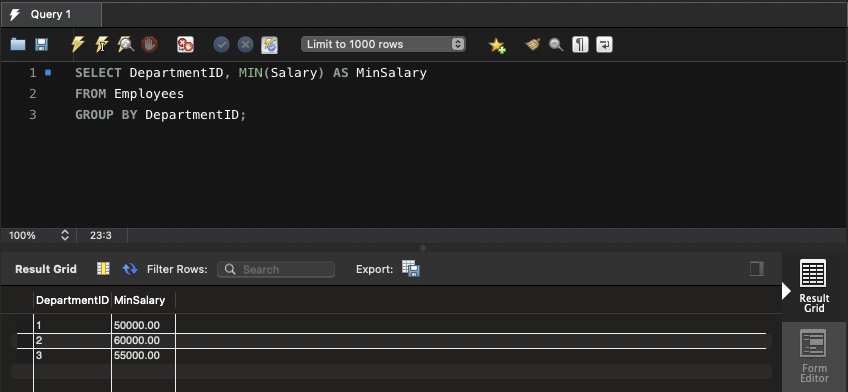SELECT DepartmentID, MIN(Salary) AS MinSalary