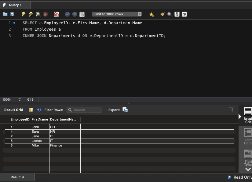 INNER JOIN Departments d ON e.DepartmentID = d.DepartmentID;