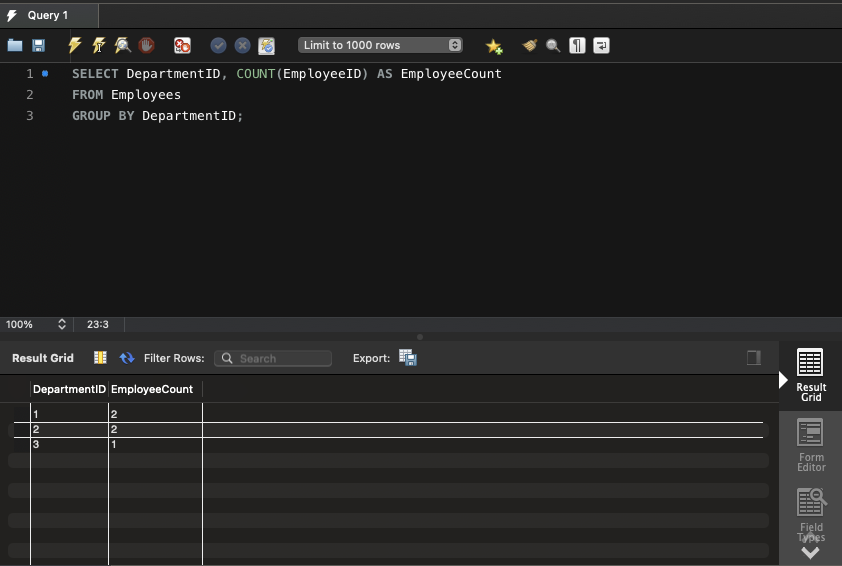 SELECT DepartmentID, COUNT(EmployeeID) AS EmployeeCount
