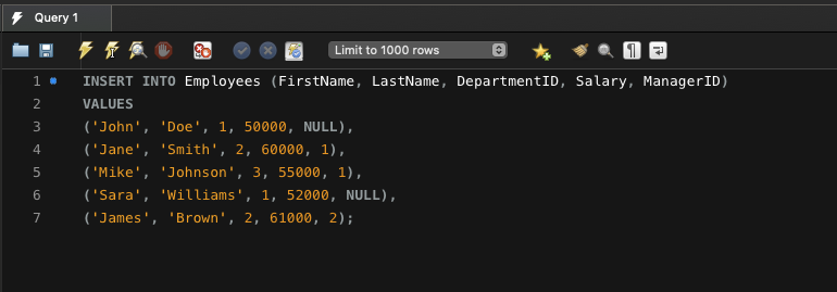 INSERT INTO Employees (FirstName, LastName, DepartmentID, Salary, ManagerID)