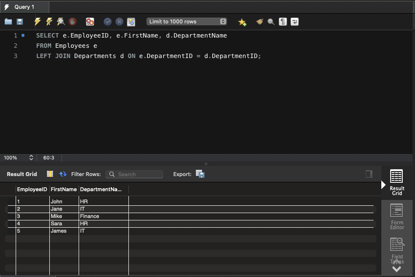 LEFT JOIN Departments d ON e.DepartmentID = d.DepartmentID;