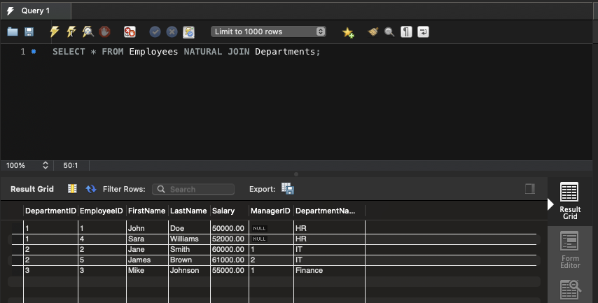 SELECT * FROM Employees NATURAL JOIN Departments;