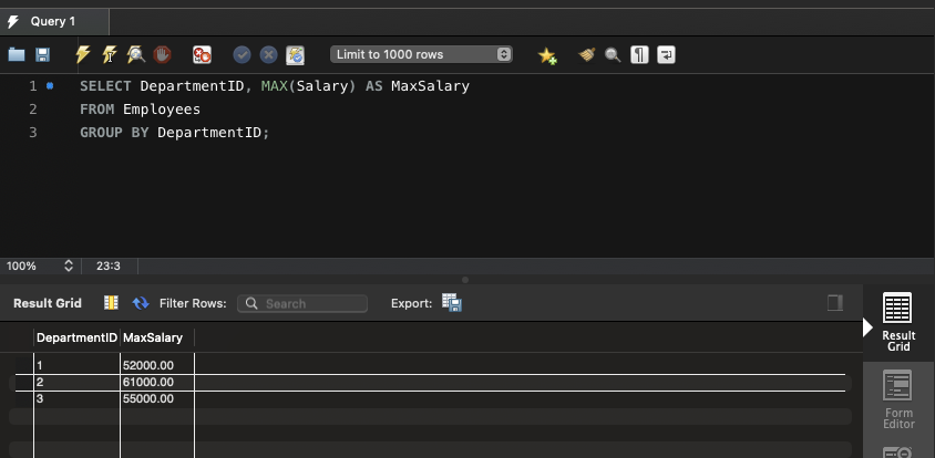 SELECT DepartmentID, MAX(Salary) AS MaxSalary